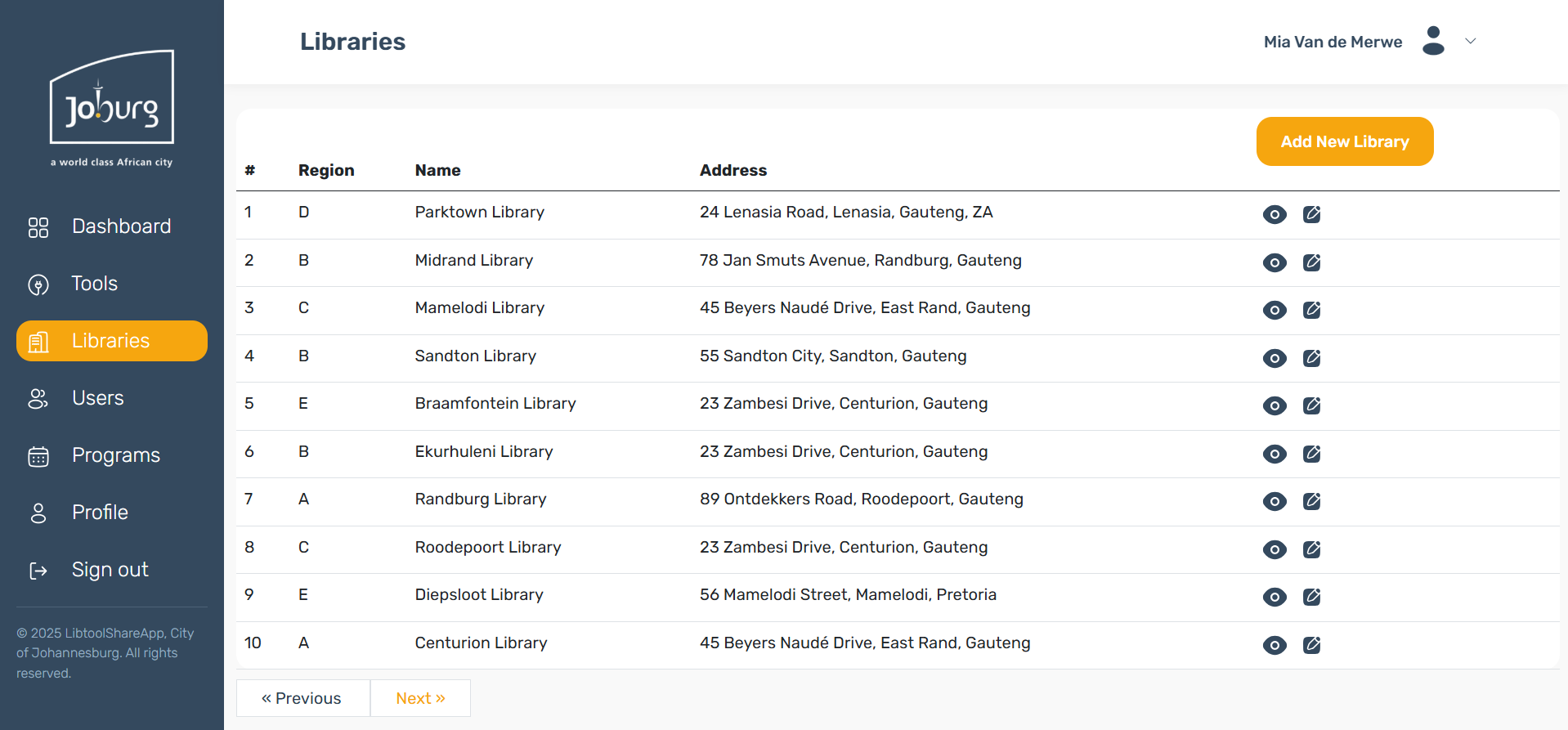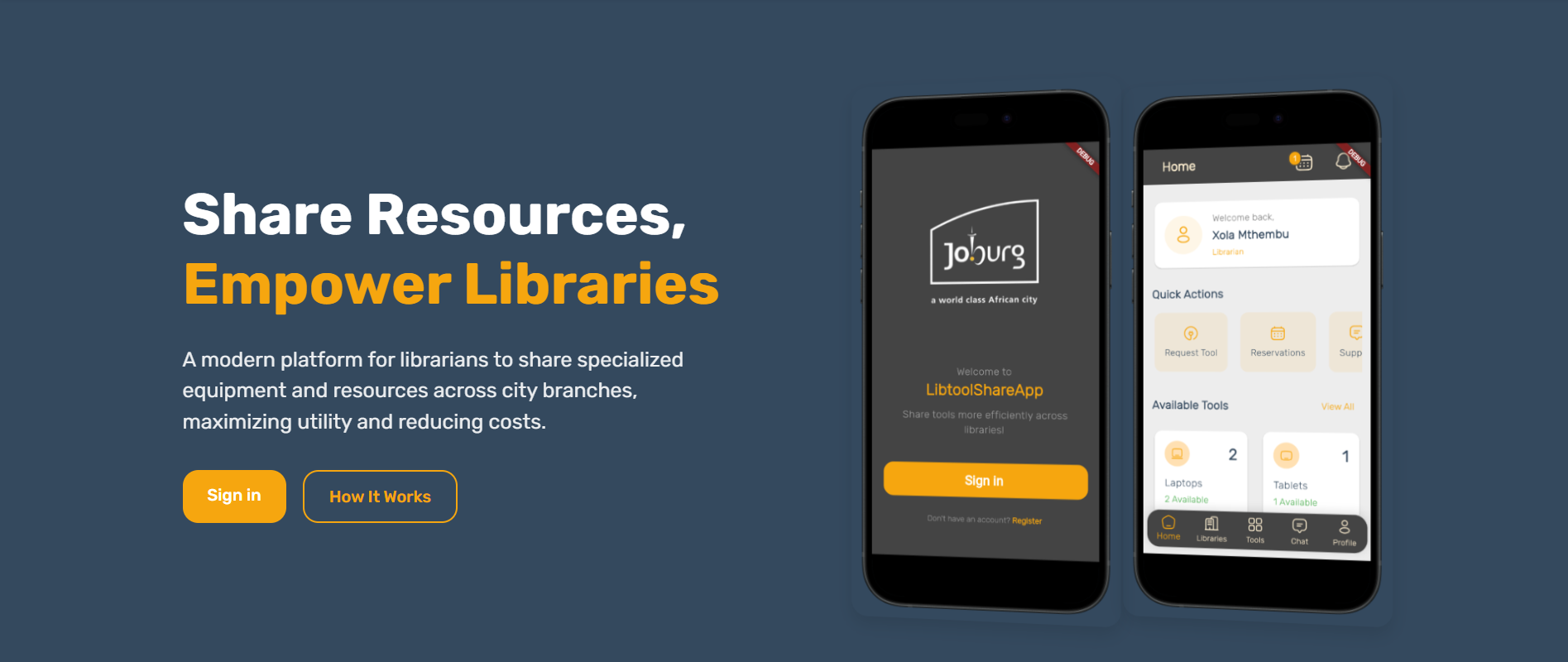 Complete solution for Johannesburg libraries to book, share, and track equipment across branches. Includes mobile app for patrons and comprehensive dashboard for library staff with real-time inventory management.